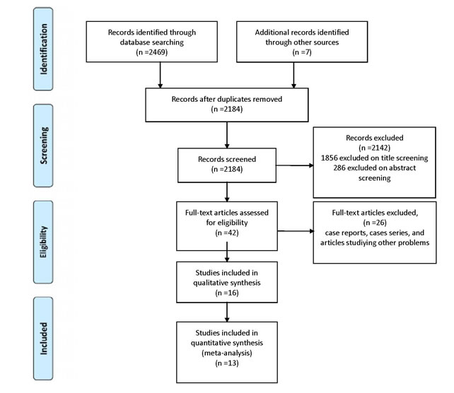 A flow diagram of the search results is presented in the PRISMA flow diagram (Figure 1). A total of 2184 records were identified through electronic databases. Removing search overlap and irrelevant studies based on title and abstract review reduced the results to 42 records. After full-text analysis, 16 studies were chosen for inclusion in qualitative synthesis, and finally 13 studies met the criteria for meta-analysis (two pooled analysis, three cohorts, and nine case-control studies). Two of the cohorts were prospective, and one was retrospective. None of the studies contained individual data.