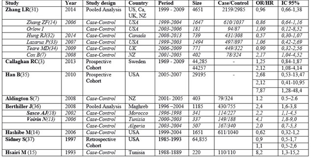 Berthiller et al. published a pooled analysis of three hospital-based case-control studies conducted in Morocco (18, 36) , Tunisia (13, 36) , and Algeria (36) . The protocols of the three studies were similar.