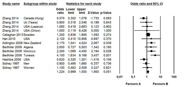 Hashibe et al. (14) studied between 1999 and 2004 a sample of 1651 with 611 lung cancer cases and